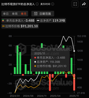 Ifølge SoSoValue-data hadde den amerikanske Bitcoin-spot-ETF-en en netto utstrømning på 3,5 milliarder dollar i november, den største månedlige innløsningen siden februar.