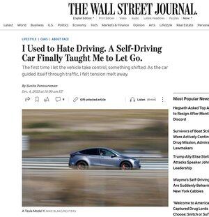 Gjennomgang av @Tesla FSD (Supervised) i WSJ: "Å kjøre har alltid føltes som en plikt for meg. Første gang jeg lot bilen (Model Y) ta kontrollen, skjedde det noe. Mens bilen styrte seg gjennom trafikken, følte jeg spenningen smelte bort. Noen dager før den føderale elbilskattefradraget utløp i september, byttet jeg inn min 7,5 år gamle Model 3 med en Model Y med FSD. For noen som meg, som liker å ha kontroll, har overgivelse aldri vært lett. Likevel var jeg her, cruisende gjennom trafikken i stille overgivelse til bilens kode og sensorer. Det føltes som frigjøring. Og nå har jeg noe bedre enn en sjåfør. Bilen min blir aldri sliten, får panikk eller vakler; Den rykker ikke til ved bremselys eller klager over trafikkork. Den kjører bare, med stille selvtillit og nærmest perfekt ro. Folk bekymrer seg ofte for at teknologien gjør oss late. Kanskje det gjør det. Men i mitt tilfelle har det gjort noe mer subtilt: Det lærte meg å stole på rytmen i turen. Det er et lite mirakel jeg aldri hadde forventet fra en bil."
