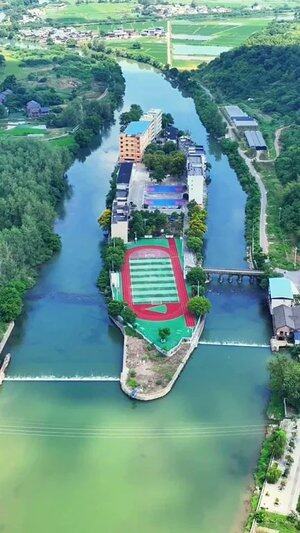 En skole bygget på en øy i en elv i Duyun, Guizhou, Kina.