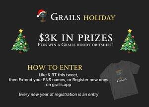 2) I januar 2026 velger vi 3 vinnere som vil vinne 1000 USD hver, pluss en Grails-hettegenser eller t-skjorte etter eget valg (som sendes til deg; må ha kontakt i hovedprofilen for ENS-navnet)