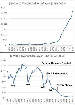 Akselerasjon etter 1913: Etter opprettelsen av Federal Reserve i 1913, Gold Reserve Act og Nixon Shock... beløpet som trengtes for å matche 1792s 100 dollar økte dramatisk.