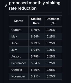 Planen var å senke staking-raten over ~7 måneder, og redusere belønningene fra ~6,79 % til ~5,26 %. Hensikten var å redusere inflasjonen og presse kapitalen mot produktiv DeFi-aktivitet i stedet for passiv staking