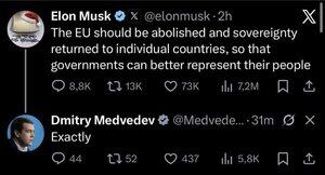Elon Musk ønsker at EU skal avskaffes. Medvedev applauderer.