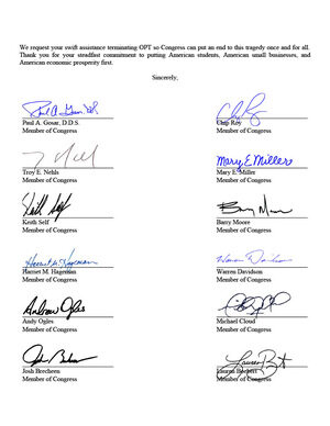 Mitt brev til Det hvite hus hvor jeg oppfordrer til å avslutte OPT-programmet. Vår regjering bør ikke insentivere utenlandske ansatte fremfor amerikanere. Dette sterkt mangelfulle statlige programmet bør elimineres. Mitt lovforslag, H.R. 2315, gjør nettopp det. 👇📷