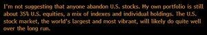 Denne spalten fanger hele året. Overskriften er høylytt og stolt over hvordan han selger Amerika, "flytter penger ut av amerikanske aksjer". Ok, greit, jeg er ikke enig, men i det minste går han walk Burry-stil. Men så i avsnitt 18 sier han "Jeg sier ikke at vi skal selge amerikanske aksjer, de utgjør 35 % av havnen min og de dominerer og vil sannsynligvis knuse på lang sikt" lol. Moralen i historien: a) aldri bli full spaltist og b) vær forsiktig når du leser ting der ute, ting er sjelden som de ser ut til å være
