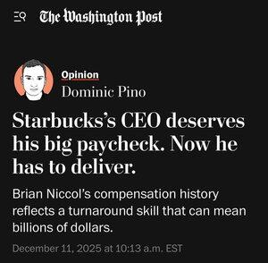 Mens Starbucks-arbeiderne streiker fordi de ikke får en rettferdig kontrakt, sier Bezos-eide Post at administrerende direktør fortjener de 96 millionene han fikk i fjor.