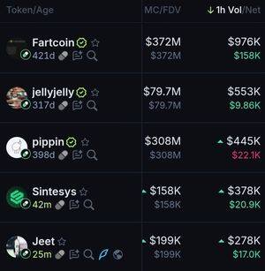 Topp Pumpfun-mynter for den siste 1 timen basert på volum: $Fartcoin $Jellyjelly $Pippin $sintesye $Jeet 🤖: