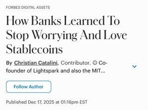 "Stablecoins dreper kanskje ikke bankene, men de vil nesten helt sikkert irritere dem til å bli bedre. Når bankene står overfor et troverdig alternativ, øker kostnaden for selvtilfredshet.» av @ccatalini