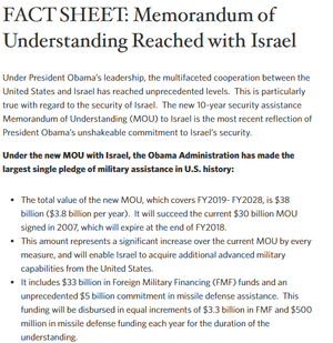 Ik wed dat heel weinig Amerikanen of iemand anders weet dat een van Obama's laatste daden was om via een juridisch contract $3,8 miljard jaarlijks aan Israël te codificeren, "de grootste belofte van militaire hulp in de Amerikaanse geschiedenis". Die verdomde nep-progressieve oplichter heeft zoveel bloed aan zijn handen.