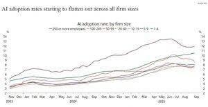 Ik zou voorzichtig zijn met een enkel datapunt als signaal, maar het is desondanks interessant. "Gegevens van het Census Bureau en Ramp tonen aan dat de adoptiepercentages van AI beginnen te stabiliseren bij alle bedrijfsgroottes, zie de onderstaande grafieken."