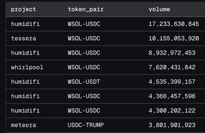 In de afgelopen maand is de USDC-TRUMP pool op Meteora de 8e pool met het hoogste volume op Solana. Het staat alleen achter meerdere SOL-stabiele pools, waarvan de meeste van Prop AMMs zijn.