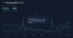 ProCap BTC (BRR) doświadcza gwałtownego wzrostu uwagi społecznej, z wzmiankami wzrastającymi do 390 na godzinę wcześniej dzisiaj, co jest poziomem ponad jedenaście razy wyższym niż jego typowa dzienna średnia. Ten wzrost następuje po niedawnej zmianie firmy na Nasdaq i jej zadeklarowanym skupieniu na akumulacji Bitcoinów, co wywołało aktywną dyskusję na temat zachowania cen, strategii i długoterminowego pozycjonowania.