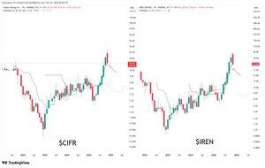 Zarówno $CIFR, jak i $IREN utrzymują miesięczne linie Ichimoku Tenkan i Kijun (niebieska i czerwona linia) jako wsparcie na miesiąc listopad jak dotąd.