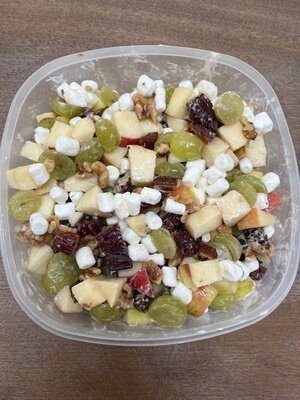 Jabłka, zielone winogrona, orzechy włoskie, daktyle, pianki marshmallow i mnóstwo majonezu.
