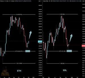 Poziom 75% Fibonacciego to jedna z najczęstszych stref, w których głębokie korekty przekształcają się w silne odbicia, a zarówno $ETH, jak i $SOL zaczynają na to reagować.