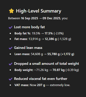 Dziś miałem wykonane badanie DEXA i oto wyniki z ~3 miesięcy od ostatniego badania - praktycznie zrealizowałem wszystkie moje cele (utrata tkanki tłuszczowej, przyrost masy mięśniowej, utrzymanie wagi, osiągnięcie % tkanki tłuszczowej na poziomie 17.x).