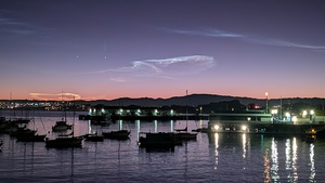 Confira essa "Água-viva Espacial". Essas nuvens interessantes só são visíveis ao entardecer, quando o sol ilumina o escape dos foguetes no alto da atmosfera. Foto: Monterey, CA 10/12/25 às 6:15