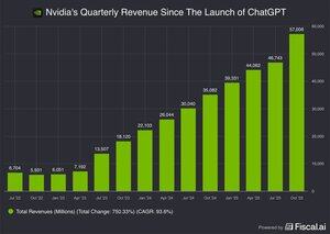 Veja quanto receita a Nvidia $NVDA tem arrecadado a cada trimestre desde o lançamento do ChatGPT Terceiro trimestre de 2022: $5,9 bilhões 30 de novembro de 2022 Q4 de 2022: $6,1 bilhões Q1 de 2023: $7,2 bilhões 2º trimestre de 2023: $13,5 bilhões 3º trimestre de 2023: $18,1 bilhões 4º trimestre de 2023: $22,1 bilhões Q1 2024: $26 bilhões 2º trimestre de 2024: $30 bilhões 3º trimestre de 2024: $35,1 bilhões 4º trimestre de 2024: $39,3 bilhões Q1 de 2025: $44,1 bilhões 2º trimestre de 2025: $46,7 bilhões Terceiro trimestre de 2025: $57 bilhões