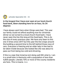 "Nunca vi fila tão longa neste banco de alimentos, está 4 vezes maior que em todos os anos anteriores. Só fomos a este 4 vezes desde 2017, mas este ano a fila dá a volta ao prédio uma segunda vez à esquerda, atrás dessas fileiras de carros. Todo mundo está congelando e uma senhora mais velha na fila teve que ser levada para dentro porque parecia prestes a desmaiar de tanto frio e tremendo."