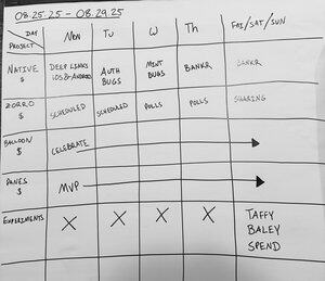 Todo fim de semana, sento-me e escrevo os temas para cada dia de cada projeto @birthdaylabs. Este papel é um enorme post-it que vai na parede acima da minha secretária. Vou riscando as coisas à medida que avanço. Aqui está o desta semana. Analógico FTW.