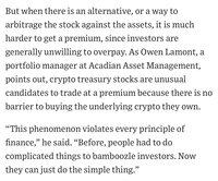 "As ações de tesouraria de criptomoedas são candidatos incomuns para serem negociados a um prêmio porque não há barreira para comprar a criptomoeda subjacente que possuem."
