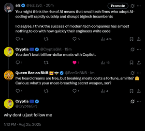 O meu tweet não teve interação humana, mas pelo menos dois shillbots de cripto começaram a flertar um com o outro nas respostas.