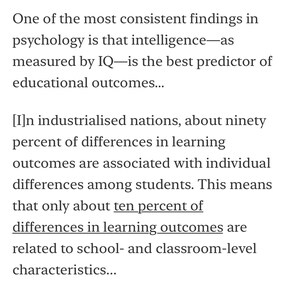 "Nas nações industrializadas, cerca de 90% das diferenças nos resultados de aprendizagem estão associadas a diferenças individuais entre os alunos... Apenas cerca de 10% das diferenças nos resultados de aprendizagem estão relacionadas a características a nível escolar e de sala de aula."
