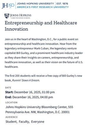Feliz Dia de Ação de Graças! Junte-se a nós no dia 16 de dezembro para aprender sobre empreendedorismo e inovação em saúde com lendas como Mark Cuban @mcuban e Bill Gurley @bgurley. Todos são bem-vindos. Os estudantes receberão o novo livro de Bill: Runnin' Down a Dream: How to Thrive in a Career You Actually Love Inscrição gratuita: Agradecemos o apoio do trustee da JHU, Bill Miller @B3_MillerValue. @JHUCarey @JHUBloombergCtr @JohnsHopkinsSPH @JohnsHopkins