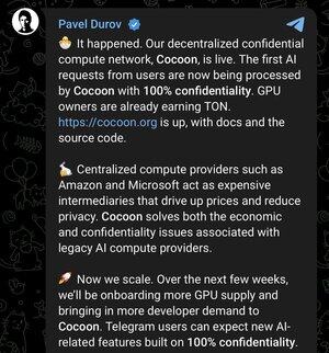 Pavel Durov acaba de anunciar uma nova rede de computação confidencial descentralizada chamada ‘Cocoon’ Os proprietários de GPU na rede ganham recompensas em TON