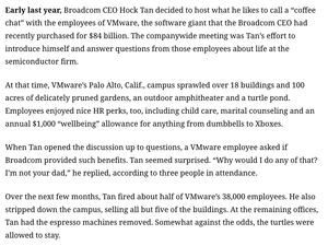 Se todos os CEOs fossem como Hock Tan, seria maravilhoso. Os investidores da Broadcom devem estar muito reassurados. Imagine ter um CEO que está tão focado em cortes de custos extremos.