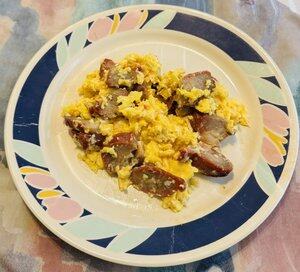 Porco BBQ chinês e ovos mexidos, uma combinação verdadeiramente de elite, mas é um mau dia para ficar sem cebolinhas.