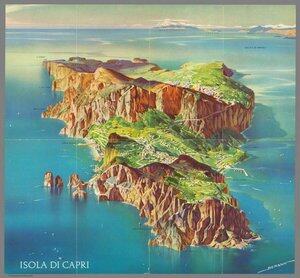 Isola di Capri, mapa turístico panorâmico, 1965. Artista: Heinrich C. Berann. Editora: Azienda Autonoma Soggiorno e Turismo, Capri. Impresso por Sigla Effe, Génova. via Coleção de Mapas David Rumsey.