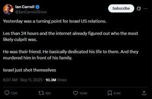Não se esqueça que apenas um dia depois de Charlie Kirk ter sido assassinado, Ian Carroll disse com absoluta certeza que Israel assassinou Charlie.