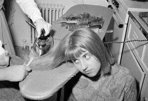Uma rapariga de 14 anos a alisar o cabelo com um ferro antes de uma noite fora com amigos, 1964