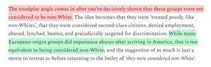 Oamenii vor să creadă atât de puternic că grupuri precum italienii au fost considerați non-albi când au ajuns în SUA, încât vor confunda a fi tratați prost cu a fi tratați ca și cum ar fi o altă rasă.