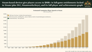 По моей модели (ссылаясь на API Valve, SteamDB, IDC и VGI), пользователи Steam владеют правами на полные игры на сумму 90 миллиардов долларов, а также десятками миллиардов через DLC и другие внутриигровые права, не считая Steamworks/Ключей Все это внезапно доступно в гостиной