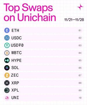 Это представляют собой топовые токены, обмененные по объему на протоколе Uniswap на Unichain с 21 по 28 ноября.