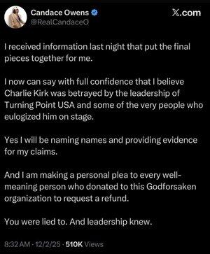 Я указывал несколько месяцев назад, что одной из ключевых целей Кэндис, помимо получения прибыли от его смерти, было уничтожение наследия и организации Чарли Кирка, потому что она недовольна тем, как он дистанцировался от нее...