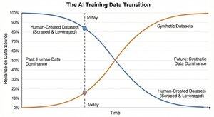 впервые использую nano banana, и он одним выстрелом показал этот график, показывающий, где мы находимся на временной шкале использования данных для обучения человека <> синтетических данных