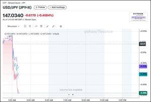 Trump avskedar Lisa Cook i ett aldrig tidigare skådat drag, och omedelbart sjunker den amerikanska dollarn mot yenen (i rött), euron (blågrönt) och det brittiska pundet (lila). Aktierna håller också på att reda ut det, men ned runt en kvarts procentenhet.