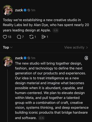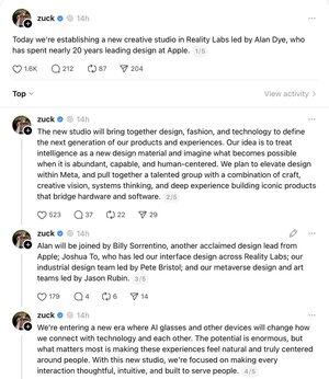 "Bugün, Apple'da neredeyse 20 yıl tasarım liderliğinde olan Alan Dye'nin liderliğinde Reality Labs'ta yeni bir yaratıcı stüdyo kuruyoruz. "