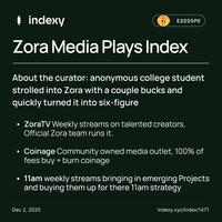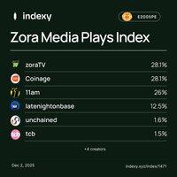 Beşinci küratör ile @zora haftalık döngüyü kapatma zamanı: @e2005pe E2005pe gerçekten olağanüstü hamleler gerçekleştirdi. Anonim üniversite öğrencisi, birkaç dolarla $Zora'a girdi ve 20 yaşındaki Warren Buffett gibi medya ile ilgili yaratıcı paralarla takas ederek burayı hızla altı haneli bir savaş sandığına dönüştürdü. Erken @coinage_media, erken @latenightonbase, erken @newyorkers_x ve GERÇEKTEN @zora_clipped erken dönem. Birkaç hafta içinde e2005pe, Zora pazarındaki içerik üreticileri için nihai kral yapımcısı olarak kendini kanıtladı. Yine de ABD'de yasal olarak içki satın alamıyorum. İşte Zora Media Plays Index ve mantığı, E' tarafından el yapımı @zora_clipped %28,1 @coinage_media %28,1 @11AMdotclub %26 @latenightonbase %12,5 @Unchained_pod %1,6 @_choppingblock %1,5 @pukecast %1,0 @FullSpecLive %0,9 @ChainLeak %0,6 @myosin_xyz %0,3 Bu endeksi takip edin ve tam performans analizlerini aşağıdan 👇 edinin Not: Endeks işlemleri kapalı beta aşamasında, erişim talebinde bekleme listesine katılın