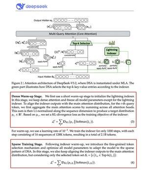 Hafif bir Lightning Indexer, her sorgu için hangi tokenların gerçekten önemli olduğunu puanlar. Az sayıda kafa, FP8'de çalışıyor, hesaplama açısından ucuz. Sonra bir seçim mekanizması yalnızca en üst-k anahtar değer girişlerini alır.