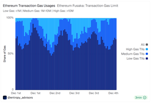 Fusaka yükseltmesinden bu yana, yüksek gaz işlemlerinde (>10 milyon) Ethereum üzerindeki gaz kullanımının oranı büyük ölçüde azaldı. Bu, yükseltme kapsamında işlemler için 16.777.216 gaz sınırı getiren EIP-7825'in ardından geldi.