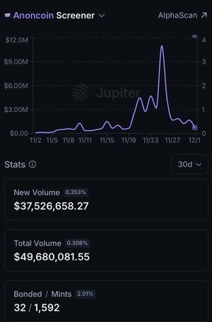 Anoncoin Kasım ayında ~50 milyon dolar işlem hacmi yaptı ve sürekli olarak Pump ve Bonk'un ardından #3 numaralı platforma oldu.