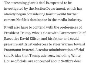 Netflix, anlaşmanın gerçekleşeceğinden o kadar emindi ki, eğer engellenerse Warners'a 5 milyar dolar ödemeyi kabul etti, bu yüzden Savunma Bakanlığı çok eğlenceli bir şey yapma fırsatına sahip. (WSJ'den haber)