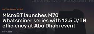 Bitcoin üreticisi MicroBT, Pazartesi günü en yeni @Whatsminer_MBT ünite serisi olan M70'i piyasaya sürdü; bu seri 12.5 J/TH verimliliği hedefliyor. Duyuru, Birleşik Arap Emirlikleri'nin Abu Dabi kentinde düzenlenen Bitcoin MENA 2025 konferansında yapıldı.