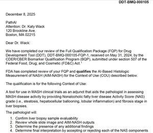 FDA офіційно кваліфікувала AIM-NASH — гістологічний інструмент на основі штучного інтелекту — для використання в клінічних випробуваннях MASH. Це стандартизує оцінку MASH і фіброзу, зменшує шум біопсії та покращує виявлення сигналів.