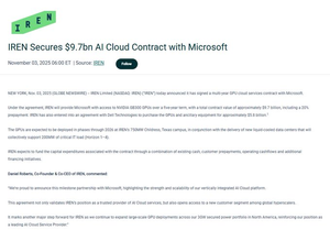 $IREN щойно підписала 5-річну угоду про хмару на основі штучного інтелекту на суму 10 мільярдів доларів США з $MSFT на розгортання $NVDA графічних процесорів GB300 на своєму майданчику Childress потужністю 750 МВт до 2026 року.