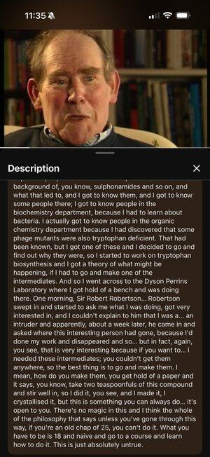 Тож я поїхав до лабораторії Дайсона Перріна, де отримав лавку і працював там. Одного ранку Роберт Робертсон... Робертсон зайшов і почав питати, чим я займаюся, дуже зацікавився, і я не міг пояснити йому, що я... зловмисник, і, схоже, приблизно через тиждень він зайшов і запитав, куди поділася ця цікава людина, бо я зробив свою роботу і зник, і тому... Але насправді, знову ж таки, це дуже цікаво, бо якщо хочеш... Мені потрібні були ці проміжні товари; Їх ніде не дістати, тож найкраще — піти і зробити їх.